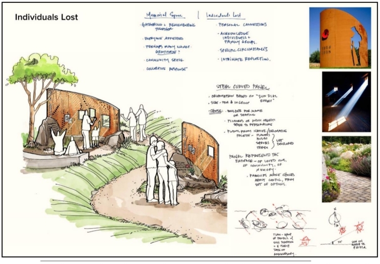 The desire is that this area celebrate the individuality and happy memories of those that were lost. Further, there is interest in incorporating representation of butterflies within the panels to be reflective of the use of butterfly outlines in the two gateways to the Slide Memorial. To this end, this call for concepts is released to refine and expand the preliminary concept, to honor the intent of the area being a positive space.